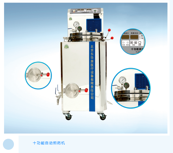 ? 東華原醫(yī)療十功能自動煎藥機將中醫(yī)藥傳統(tǒng)文化與現(xiàn)代科學(xué)技術(shù)深度結(jié)合,具備多種先進的中藥煎煮功能,先煎后下,滿足不同需求;自動加熱,文武火可調(diào);數(shù)控定時,無味煎藥;升溫滅菌,滑動鍋蓋;電動攪拌、自動加水計量;電動擠壓,藥渣自動分離;自動清洗,蒸汽冷凝,安全有保障……此外,十功能自動煎藥機還保留了傳統(tǒng)特色,具備常壓煎煮功能,提供多元化中藥煎煮解決方案。