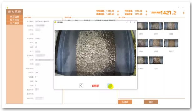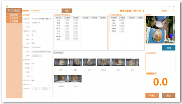在審方系統(tǒng)中,詳細(xì)列出了處方信息、自動(dòng)(預(yù)計(jì)/實(shí)際重量)、手動(dòng)(預(yù)計(jì)重量)、預(yù)計(jì)總重量、自動(dòng)調(diào)劑圖片、審方照片、審方員編號等,其中自動(dòng)調(diào)劑圖片清晰可見,便于審方員一一核對。