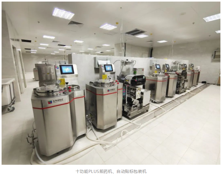 本次醫(yī)院智慧中藥房新近配備了30臺東華原醫(yī)療十功能PLUS煎藥機,10臺中藥湯劑自動貼標包裝機,是目前全國范圍內(nèi),第一家同時使用這兩種先進設(shè)備的煎藥中心。