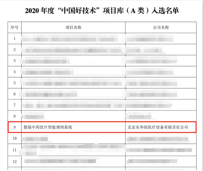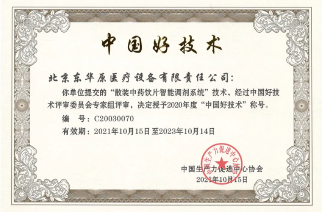 2020年度共征集“中國好技術(shù)”項目332個,其中20個項目入選“中國好技術(shù)”項目庫(A類),東華原醫(yī)療“散裝中藥飲片智能調(diào)劑系統(tǒng)”技術(shù)榜上有名。此次“中國好技術(shù)”獎項的授予是對東華原醫(yī)療智能調(diào)劑技術(shù)的有力肯定!