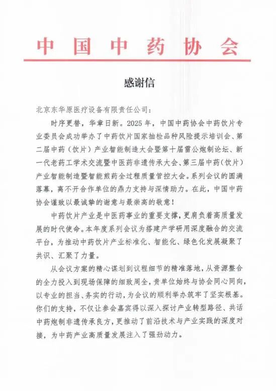 近日,東華原收到中國(guó)中藥協(xié)會(huì)發(fā)來(lái)的感謝信,對(duì)第三屆中藥(飲片)產(chǎn)業(yè)智能制造暨智能煎藥全過(guò)程質(zhì)量管控大會(huì)期間帶來(lái)的寶貴經(jīng)驗(yàn)分享與全力支持表示感謝,字里行間寫(xiě)滿對(duì)東華原企業(yè)創(chuàng)新實(shí)力的高度認(rèn)可。
